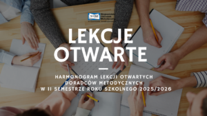 Harmonogram lekcji otwartych doradców metodycznych w II semestrze roku szkolnego 2025/202627 marca 2026Doradcy metodyczni z Wojewódzkiego Ośrodka Metodycznego w Gorzowie Wielkopolskim zapraszają nauczycieli na prowadzone przez siebie lekcje otwarte […] Czytaj więcej