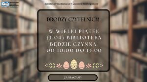 KOMUNIKAT1 kwietnia 2026Biblioteka Pedagogiczna będzie czynna w następujące soboty: 11 i 25 kwietnia br. […] Czytaj więcej