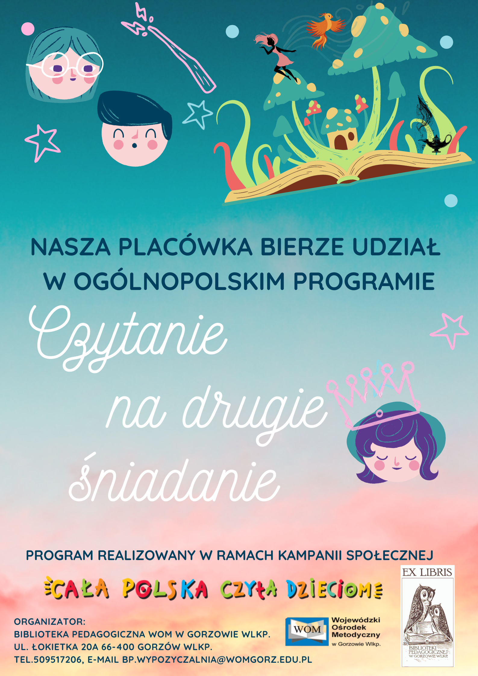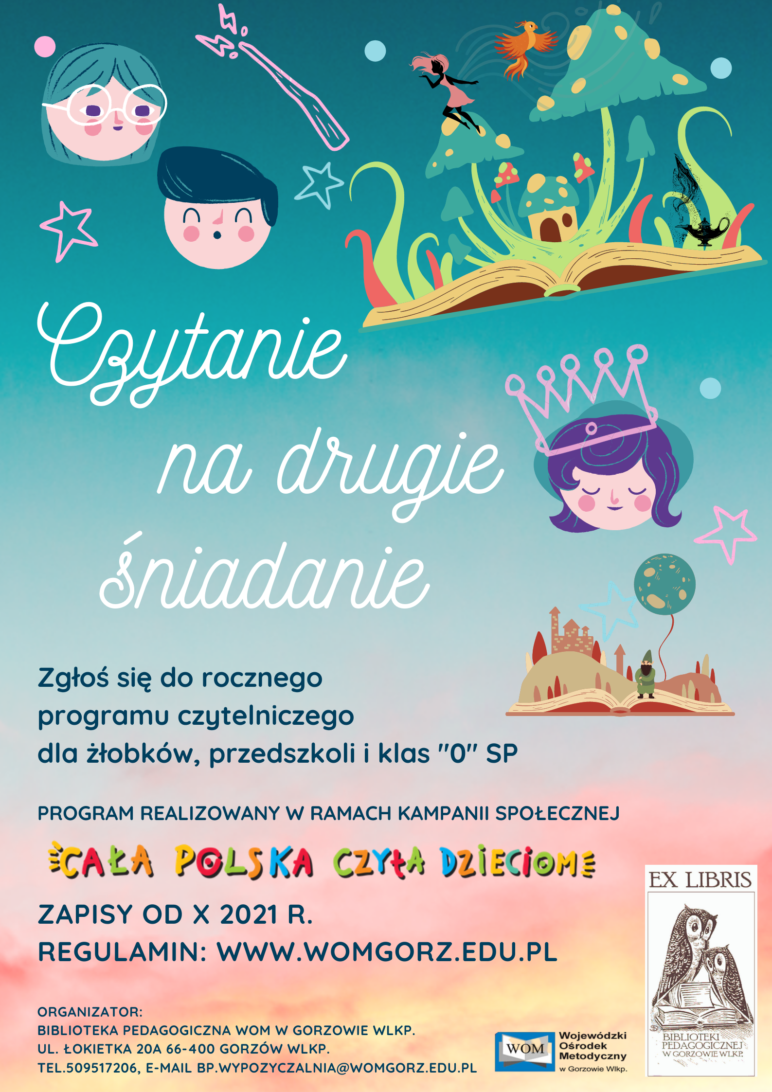 Biblioteka Pedagogiczna Wojewódzkiego Ośrodka Metodycznego w Gorzowie Wielkopolskim po raz czwarty ma przyjemność zaprosić przedszkola, żłobki oraz dzieci z klas „0” szkoły podstawowej do udziału w programie czytelniczym Czytanie na drugie śniadanie. Tegoroczna edycja ma zasięg ogólnopolski.