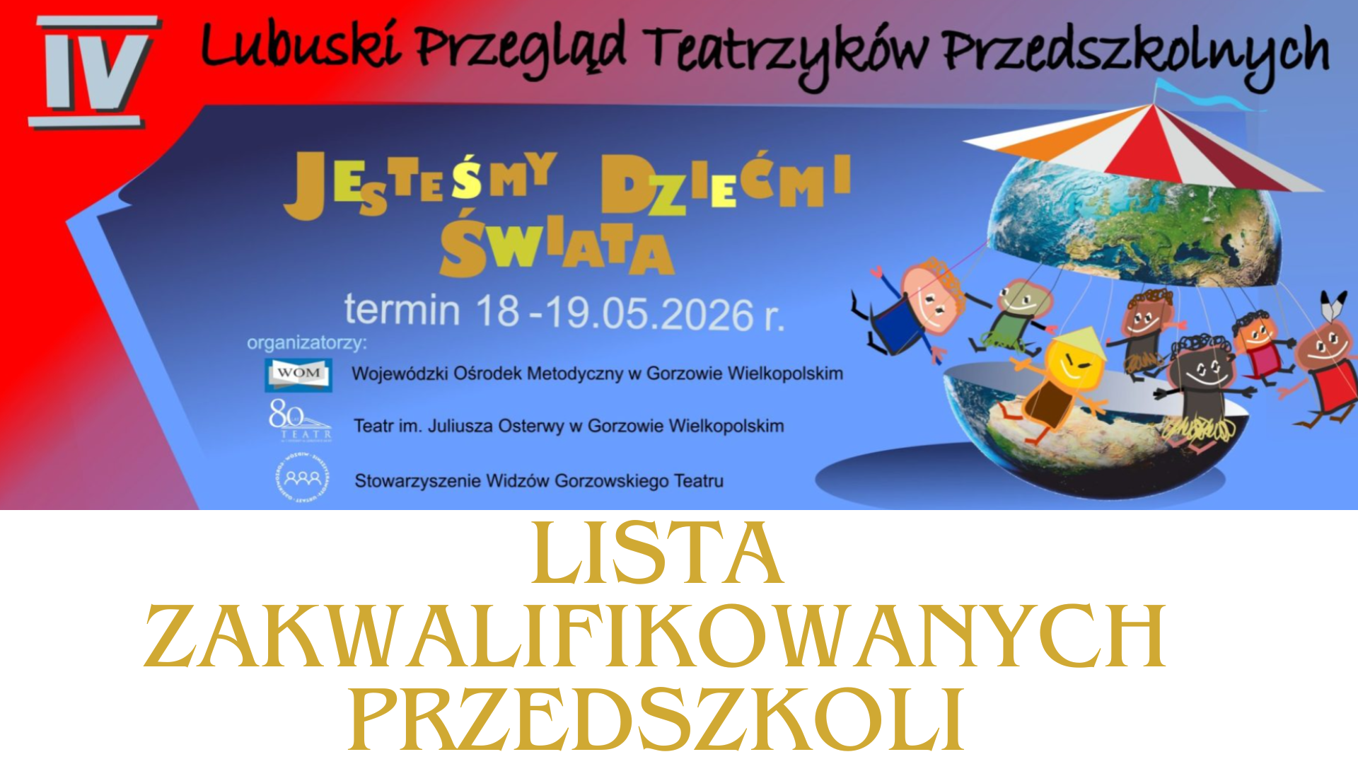 Poniżej przedstawiamy listę przedszkoli, które zakwalifikowały się do udziału w IV Lubuskim Przeglądzie Teatrzyków Przedszkolnych pod hasłem Jesteśmy dziećmi świata. Jednocześnie wierzymy, że gdzie dzieci podają sobie dłonie, tam rodzi się pokój, a wspólna twórczość pozwala odkrywać, że z wielu kultur powstaje jedna mozaika serc.