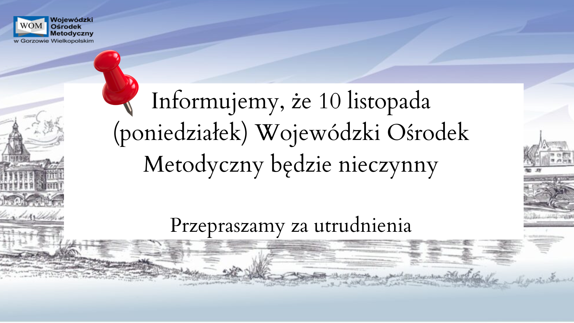 Informujemy, że 10 listopada (poniedziałek) Wojewódzki Ośrodek Metodyczny będzie nieczynny.