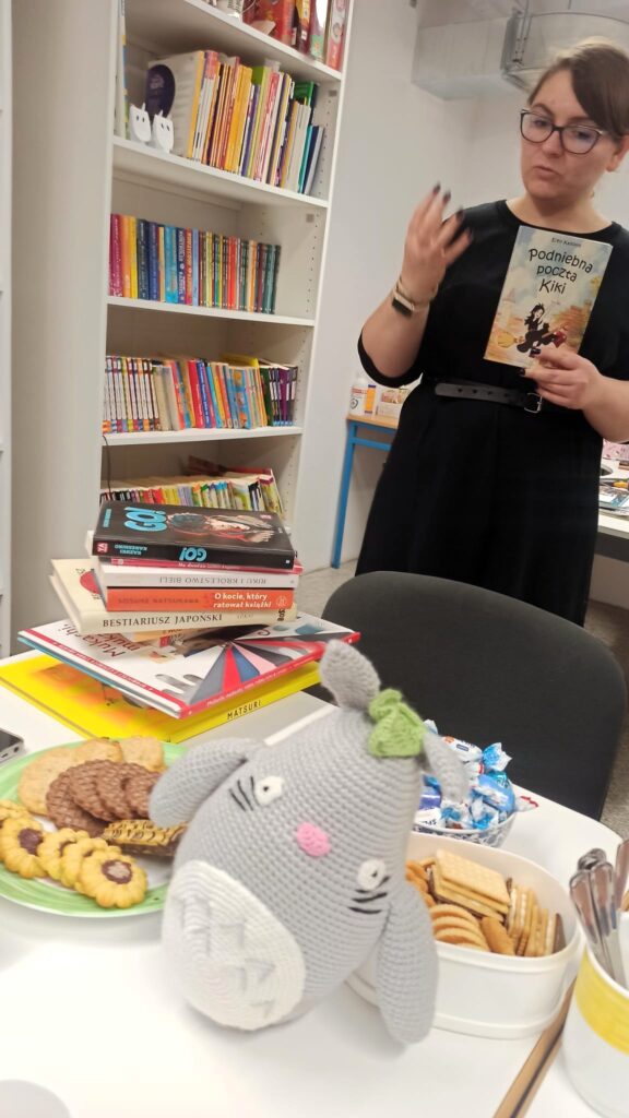 Tematem przewodnim spotkania była manga jako narzędzie pracy bibliotecznej, a całość odbywała się pod hasłem „Manga w bibliotece – od pasji do projektu”. Katarzyna Piskorz, bibliotekarka SP nr 1, bardzo ciekawie opowiedziała nam historię szkoły oraz podzieliła się z uczestnikami swoją bogatą wiedzą, doświadczeniem czytelniczym oraz wieloletnią pasją do mangi i literatury japońskiej.