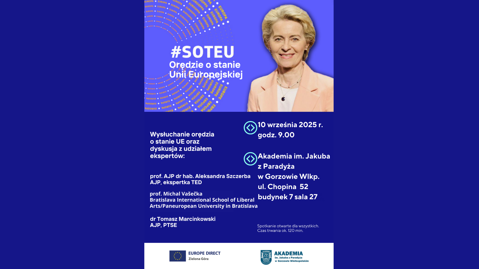 W szczególności zapraszamy gorzowskich nauczycieli ze szkół średnich zainteresowanych tematyką integracji europejskiej (nauczycieli WOS, historii, językowców, wychowawców klas, dyrektorów szkół), którzy byliby chętni uczestniczyć w wydarzeniu organizowanym 10.09.2025 r. w Gorzowie Wielkopolskim przez Punkt EUROPE DIRECT Zielona Góra wspólnie z Akademią im. Jakuba z Paradyża z okazji orędzia o stanie UE /SOTEU/.